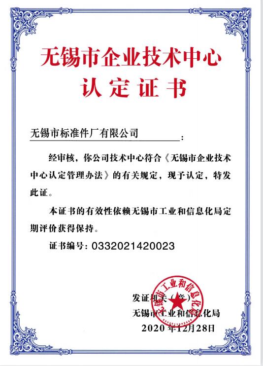 无锡市企业技术中心认定证书.